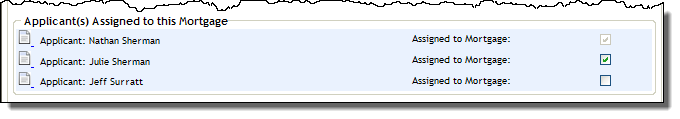 The primary applicant cannot be unassigned from the mortgage, and therefore its checkbox cannot be unchecked. To change the primary applicant, see Changing the Primary Applicant.